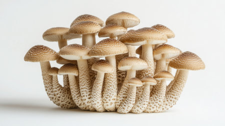 A close-up of fresh Shimeji mushrooms with their delicate, clustered caps and slender stems, set against a white background to highlight their texture and color