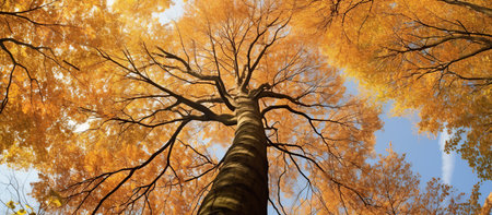 Autumn tree with yellow leaves, panoramic view from below.