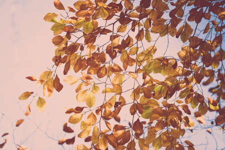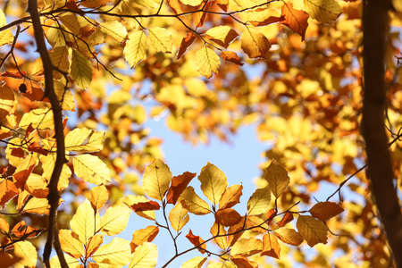 Tree with beautiful bright leaves under blue sky on sunny autumn day, closeup