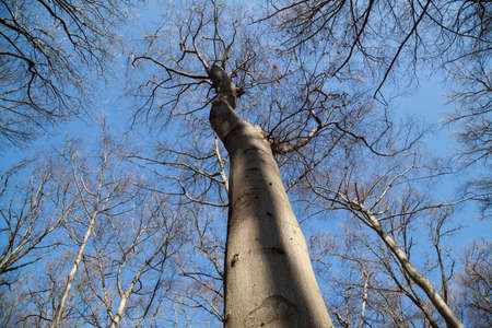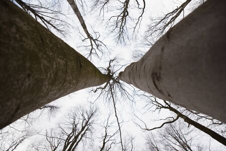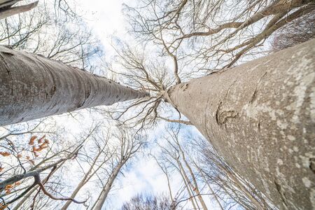 Looking up to the cloudy sky through beeches which have lost their leaves. Winter season in leaves forest.