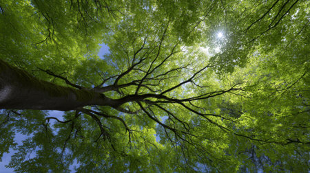 low angle view of tall tree with green leaves in springtime