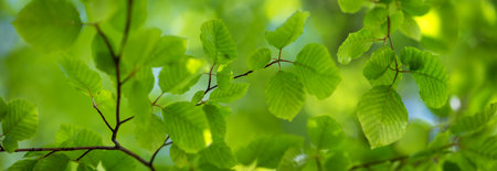 Panoramic background with fresh young foliage of the tree.