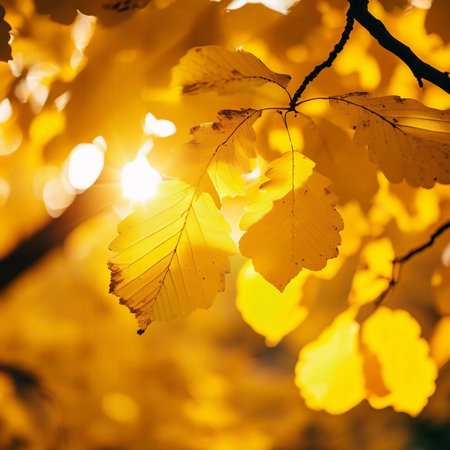 A close up of a tree with yellow leaves and sun shining through, AI