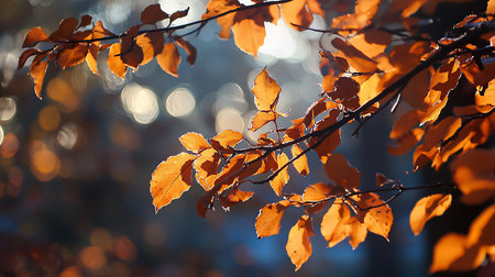 Close-up of vivid orange autumn leaves on sunlit branches, capturing the warmth and richness of fall foliage. The shallow depth of field blurs the background into soft bokeh, emphasizing leaf texture and veins. Ideal for autumn-themed design, nature photography, and marketing materials celebrating fall colors and outdoor scenes.