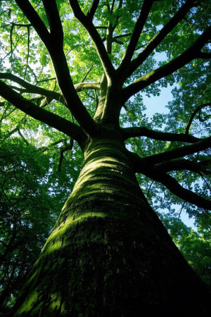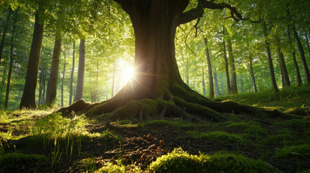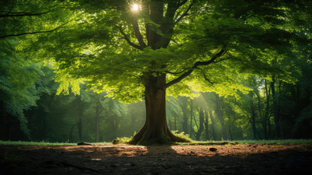 A stunning view of a majestic tree standing in a tranquil forest. Sunlight streams through vibrant green leaves, illuminating the mossy ground and creating an ethereal atmosphere.