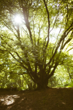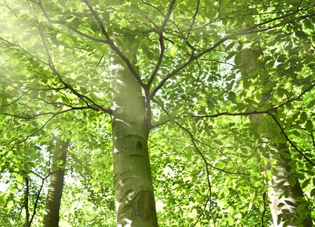 Beech tree in green forest with sunbeams and lens flare
