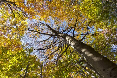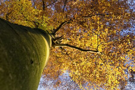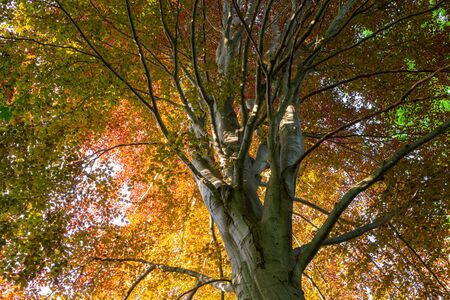 Bottom view a big gray beech tree in autumn in a windy day