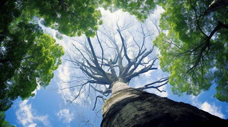 Upward perspective of tall trees with lush green foliage arching over a vibrant blue sky in a serene woodland setting