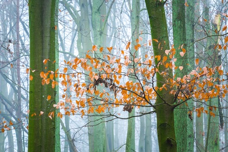 Close up of orange beech leaves on branch in autumn foggy forest. Foggy day in beech forest.