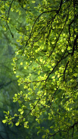 Sunlight Filtering Through Lush Green Branches, Creating Tall Vertical Trees in Woodland Nature