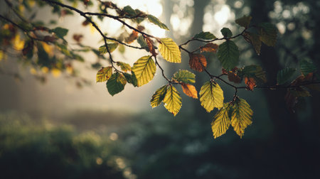 A serene close-up of dewy leaves clinging to a branch, illuminated by soft morning light, set against a misty forest backdrop during autumn. Perfect for nature lovers.