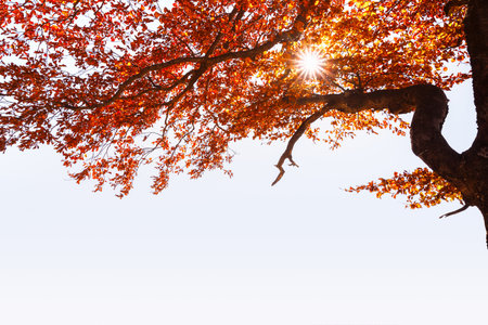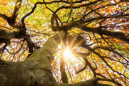 The autumn sun shining through the crown of a tree with visually impactful branches