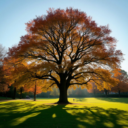 Beautiful autumnal tree in the park with sun rays and blue sky
