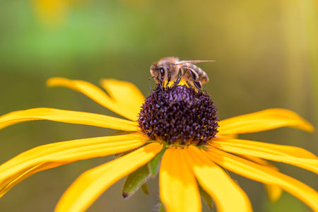 Close-up photo of a Western Honey Bee gathering nectar and spreading pollen on a young Autumn Sun Coneflower (Rudbeckia nitida).