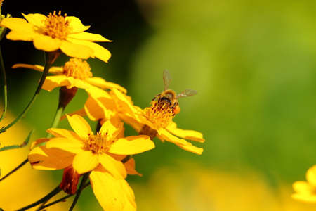 Honey bee collecting pollen in a dandelion flower. Yellow flowers. Insect at work. Photo from nature