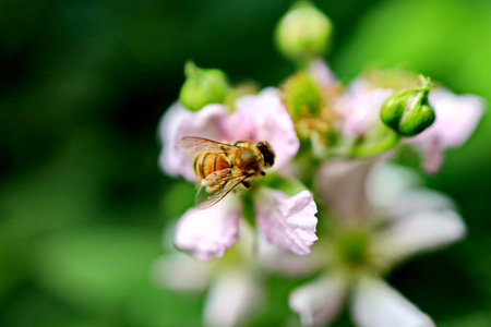 Close-up of a honey bee looking for pollen on a raspberry blossom against a green background