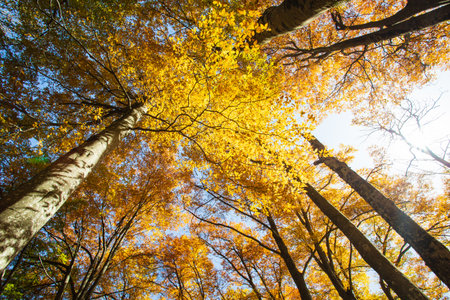 Golden autumn leaves filling forest canopy with sun passing through branches