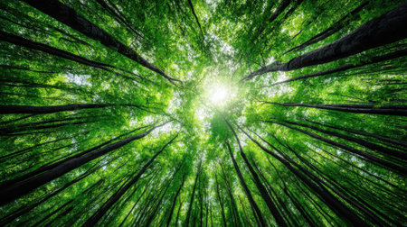 A breathtaking perspective from below, gazing upwards through a dense forest of tall trees with vibrant green leaves, as sunlight streams through the canopy.