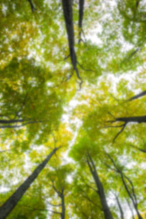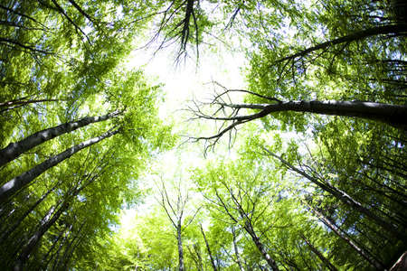 looking up in the green forest towards sunlight in spring. High quality photo