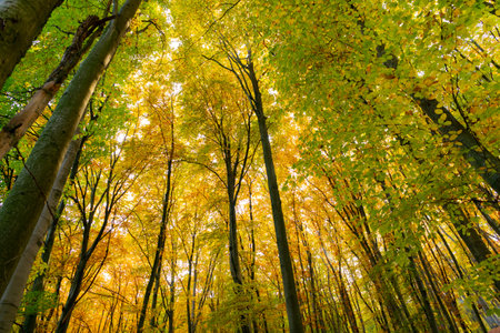 Autumn sunny beech leaves in the beech forest