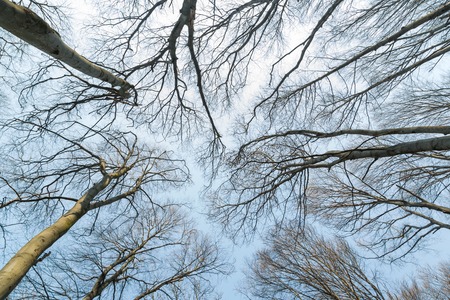 Branches and twigs of trees without leaves in winter. Photographed against the blue sky from below.