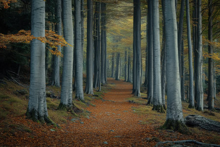 Autumn leaves, trees, seasonal colors in the forest. Sunbeams, long shadows around a path in the woods. Wide scale panoramic AI generated image of a forest scene.