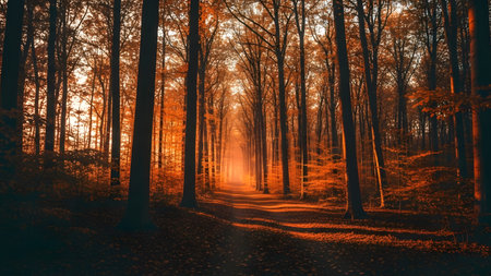 Autumn forest at sunset. Beautiful landscape with autumn trees and path