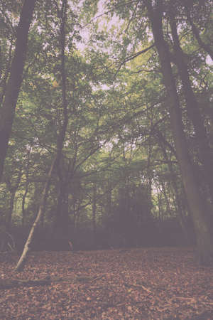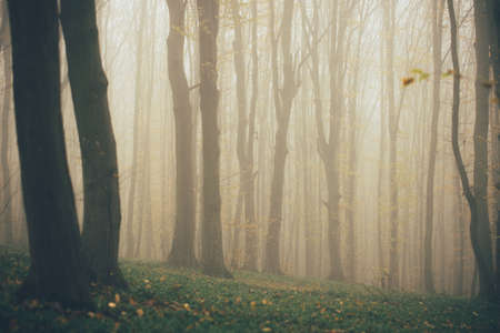 Forest in fog with mist. Fairy spooky looking woods in a misty day. Cold foggy morning in horror forest
