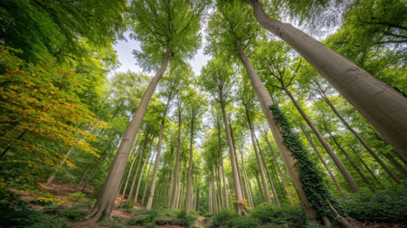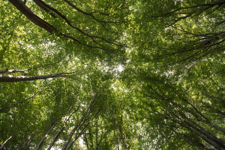 autumn forest of beech trees with the sun illuminating the green treetops view from below, nature green wood background, ecology and nature conservation concept