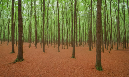 Flat design is showing deciduous trunks rising in woodland with green canopy and brown leaf floor. Nature, forest, woodland, greenery, ecology, tranquility, organic