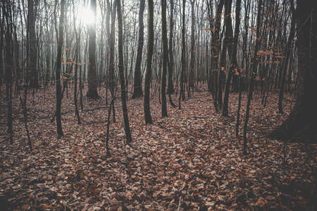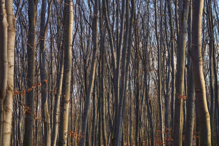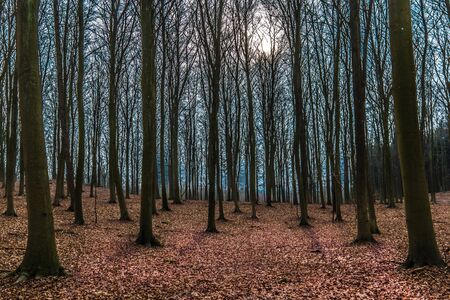 Winter day in a beech forest with the sun behind the branches, old leaves cover the ground, Jaegerspris, Denmark, February 19, 2018