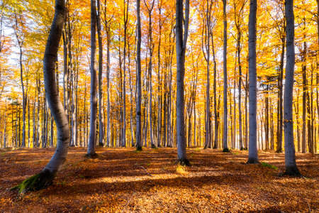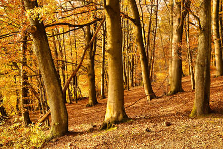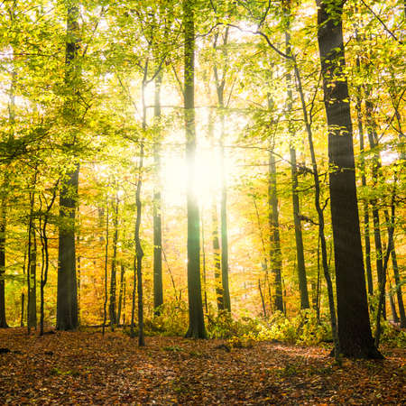 Beautiful autumn forest with sun rays shining through the trees. Natural background
