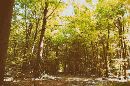 Sunlight in the green forest, spring time, nature series.