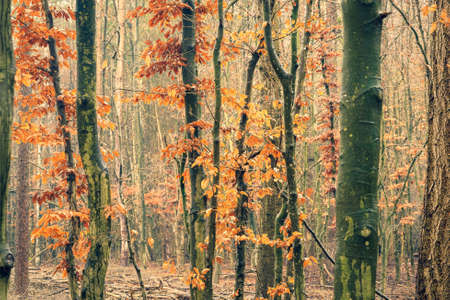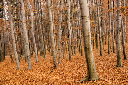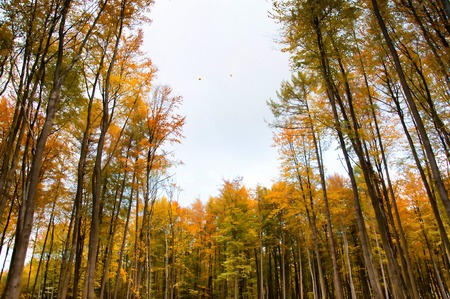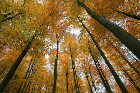 Tree canopy in autumn beech forest.