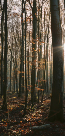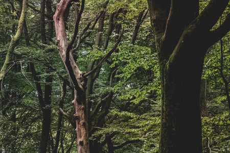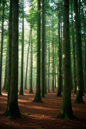 Sunlight Filtering Through Lush Green Branches, Creating Tall Vertical Trees in Woodland Nature