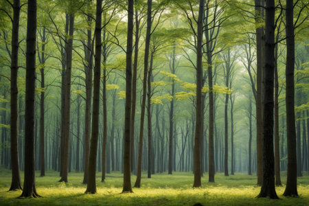 Tranquil scene of a vibrant forest with a mysterious wilderness generated by artificial intelligence