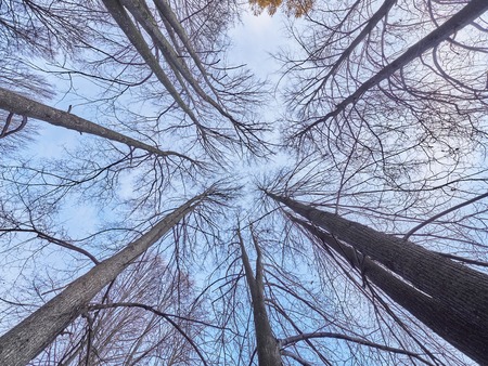 Looking up at the canopy of trees in the forest from below.