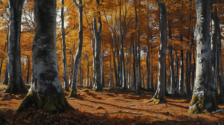 Central deciduous trunk is rising toward canopy in flat design forest scene, with orange leaves. Nature, woodland, outdoor, seasonal, landscape, tranquility, ecology