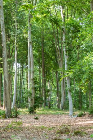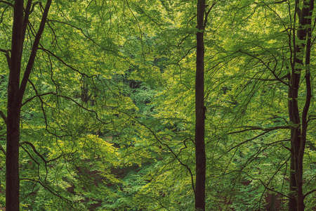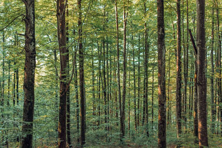 Lush green beech forest on Mount Vujan, Serbia. A tranquil, untouched woodland spring landscape with tall trees and soft undergrowth
