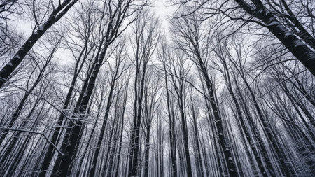 Winter forest in a foggy day with beech trees in the foreground