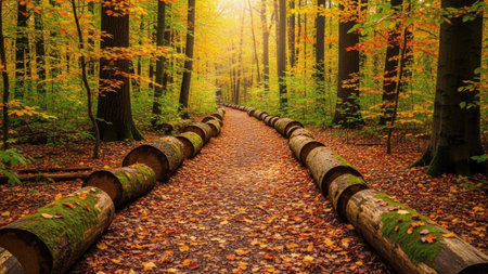 Path in autumn forest with fallen tree trunks and colorful leaves.