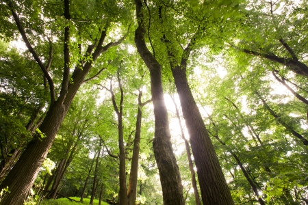 forest trees view from below into the sky. nature green wood sunlight backgrounds