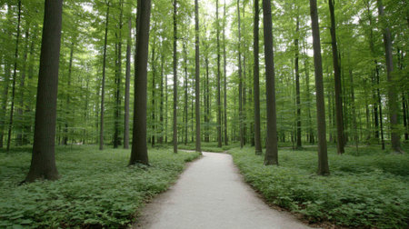 A sunlit beech forest path winding through tall green trees and ferns creating a peaceful tranquil outdoor scene