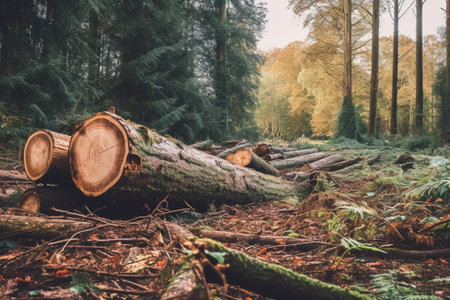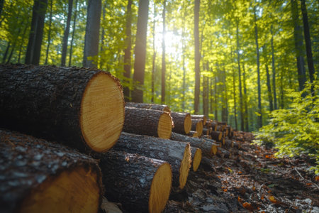 Woodpile of cut tree trunks in the forest, selective focus
