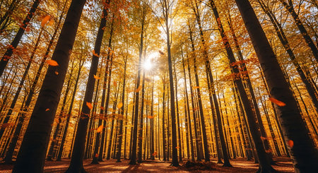 Autumn forest with yellow leaves and sun rays in the background.