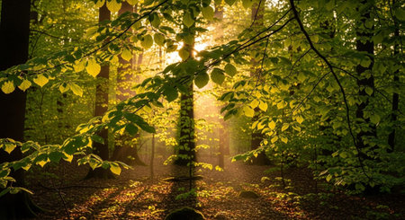 Tranquil scene as sunlight pierces through the verdant canopy of a dense forest