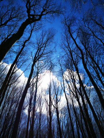 low angle view into treetops with blue sky in the background, outdoors