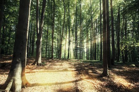 Beautiful morning scene in the forest with sun rays and long shadows