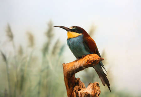 Colorful bee eater sitting on a branch of reed