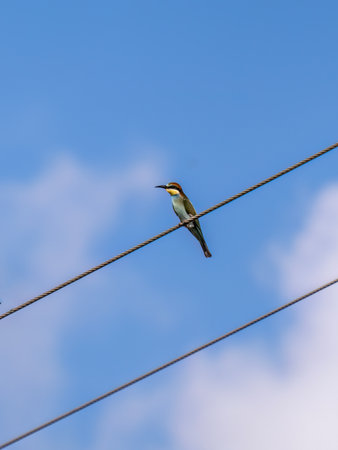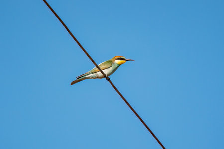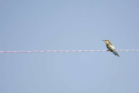 Bee-eater sitting on an electric wire against a blue sky